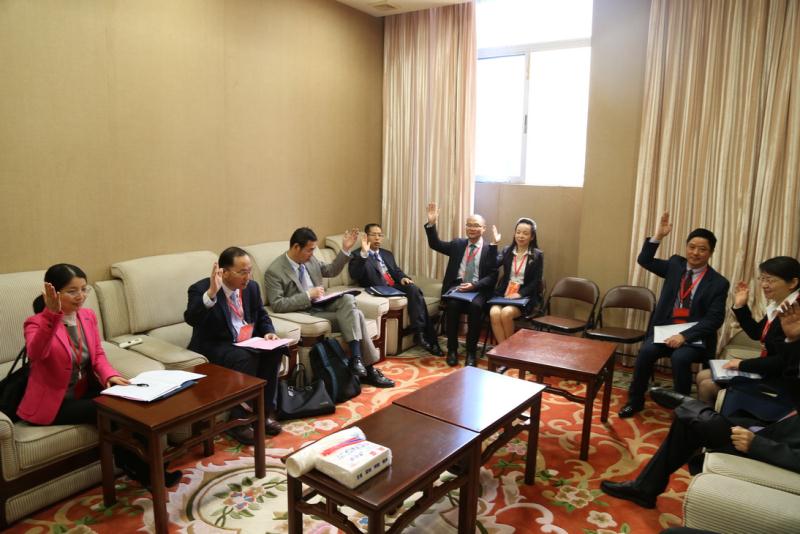 上午8点30分,第一次全体会议正式召开。我院领导班子成员及各代表团推选的团长在主席团就座,全体代表们起立齐唱国歌。