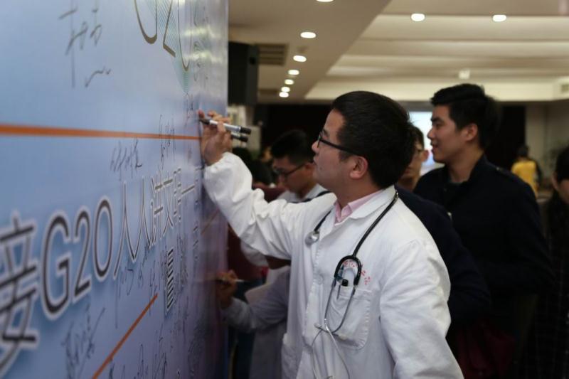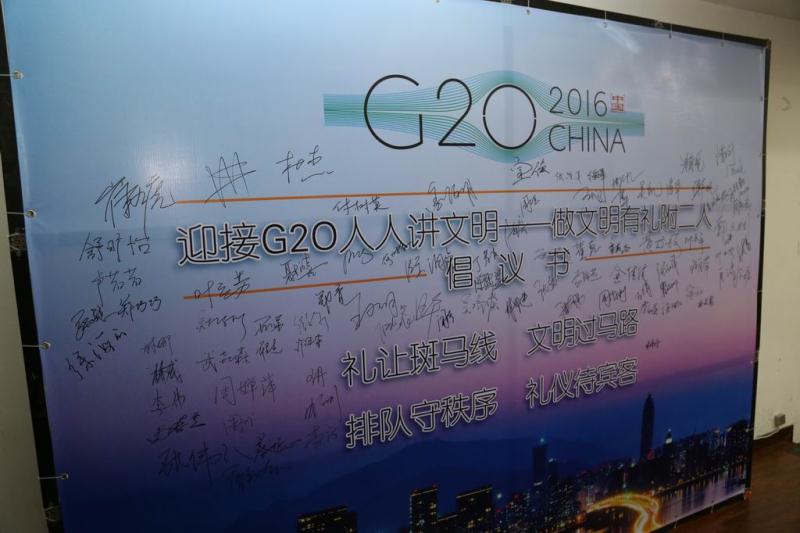 同时,我院为倡导全院广大干部职工践行“礼让斑马线、文明过马路、排队守秩序、礼仪待宾客”的文明风尚,特于3月30日的“道德讲堂”活动中举行了“迎接G20人人讲文明——做文明有礼附二人”倡议书签名墙签字仪式。广大职工积极响应倡议,纷纷在签名墙上写下自己的名字。