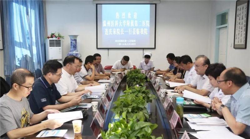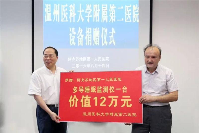 次日,连院长,林院长一行人来到新疆阿克苏地区第一人民医院访问交流,对我院援疆干部颜孙舜医师进行慰问并在交流会上捐赠了价值12万元的医疗设备。会上新疆阿克苏地区第一人民医院党委书记艾克拜尔•艾合买提代表医院党委向连庆泉院长一行表示欢迎,对颜孙舜主任在医院期间的工作情况进行了介绍,感谢我院输送了这么优秀人才到新疆,也对我院一直以来的大力支持和积极援助表示感谢。并希望以对口援助为契机,加大两院的往来交流,特别是我院的国家级住院医师规范化培训基地、儿科国家临床重点专科的成功建立模式,以达到2020年“组团式”援疆工作目标。颜孙舜主任表示非常感谢两位院领导不远千里来到新疆进行慰问工作,这次的工作经历将是我人生中最难忘的一段时光,同时也让我体会到了互帮互助,民族团结,共同进步的重要意义,接下来我会以更加饱满的精神投入到工作中,不负医院领导对我的期望。