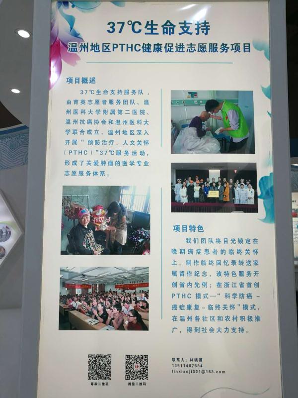 第三届中国青年志愿服务项目大赛自2016年4月开始启动,面向全国共征集了近6000个志愿服务项目,共分为包括阳光助残、关爱农民工子女、邻里守望与为老服务、环境保护与节水护水、扶贫开发与应急救援、文化宣传与网络文明、禁毒教育与法律服务、理论研究与基础建设、其他领域等9个志愿服务项目。而我院《37℃生命支持——温州地区PTHC健康促进志愿服务项》目和温州医科大学第二临床医学院的《“生命相髓,为爱而生”志愿服务项目》,从温州市145个志愿项目中披荆斩棘、一路过关斩将,在全省880多个浙江省参赛项目中层层突围获得金银奖,并最终作为全省5个精品项目公开展示,代表浙江省参加全国志愿服务大赛。
