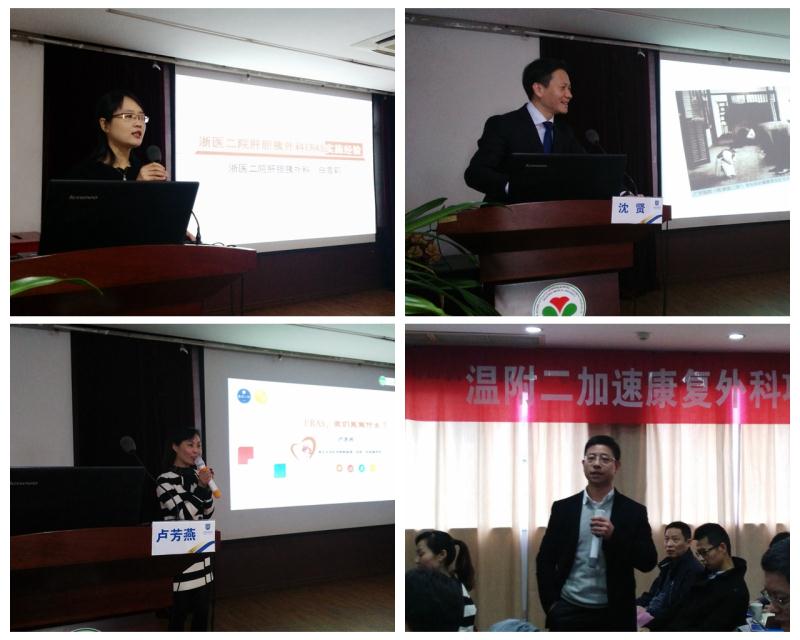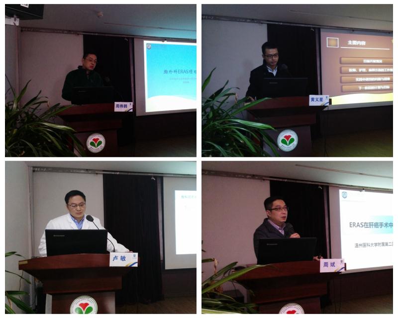 会议首先由浙二医院肝胆胰外科白雪莉主任、卢芳燕护士长介绍浙二ERAS实施经验。随后各试点科室与专家进行了现场互动,取得了良好的效果。试点科室、麻醉科、质管处分别汇报了项目启动以来所取得得成绩、不足与进一步计划。浙二医院梁廷波院长对我院开展情况做了点评,梁院长认为我院作为非国家教育部直属大学附属医院能够高瞻远瞩在医院层面推动开展加速康复是非常难得,建议我院循序渐进开展ERAS,逐步将医院行政层面推动转变为医师自觉自发行为。