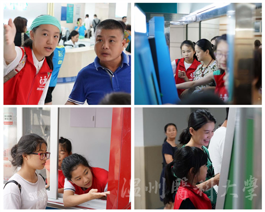 培训结束后,大学生志愿者带领职工子女志愿者开始第一次志愿者体验。在自助机前,职工子女志愿者按照标准的操作流程,帮助患者和家属使用自助机;在各楼栋之间,控烟小组拿着装水的一次性水杯,不畏烈日、定时巡逻,劝阻吸烟者熄灭烟头,倡导吸烟有害健康的卫生观念;在志愿者服务站内,熟悉医院楼层分布的职工子女志愿者正确引导患者和家属,并为体弱的患者提供力所能及的帮助。