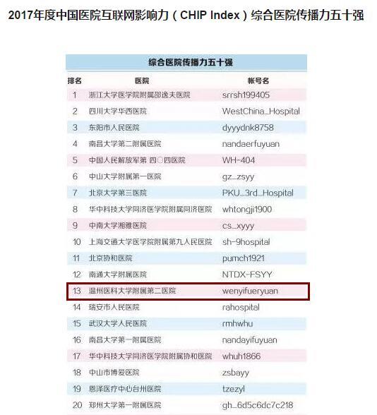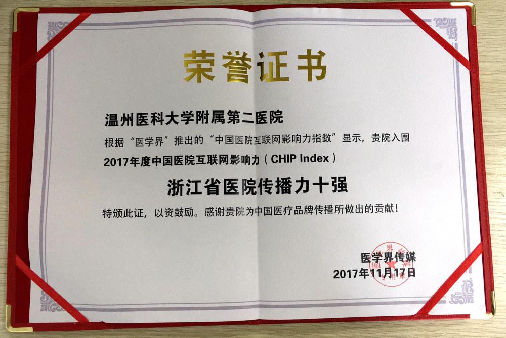 11月17日,“第三届中国医院宣传年会”在广州深圳开幕,来自全国300余家医院逾600名医院宣传工作人员济济一堂,交流经验、碰撞思想。此次“医学界”联合知名机构清博新媒体指数平台,对2017年全国4000多家的医院的微信平台进行多方位数据跟踪,隆重推出“中国医院互联网影响力指数”。我院荣获了2017年度中国医院互联网影响力“全国百强”、“浙江省医院传播力十强”两项殊荣。