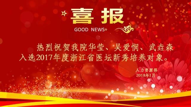 日前,根据根据原省卫生厅、省财政厅《关于印发〈浙江省卫生高层次人才培养工程实施办法〉的通知》(浙卫发〔2013〕1号)精神,和省卫计委《关于做好2017年度浙江省医坛新秀培养对象推荐选拔工作的通知》精神,经个人申报、各级单位择优推荐、专家综合评审、省卫生高层次人才培养工程领导小组审定等程序,我院华莹、吴爱悯、武垚森等三人入选2017年度浙江省医坛新秀培养对象。