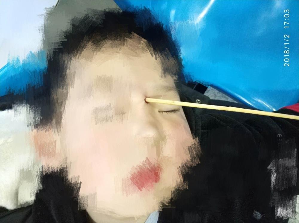 近日,我院眼科收住了一例特殊的小病人。当天下午近五点,一对焦虑而疲惫的夫妻急急地抱着一个明显哭过的小孩来到眼科,小孩2岁,鼻根部近右眼眶一根长长的竹签格外显目,外露的竹签不短,可是接诊医生查屹担心的是戳入的竹签: