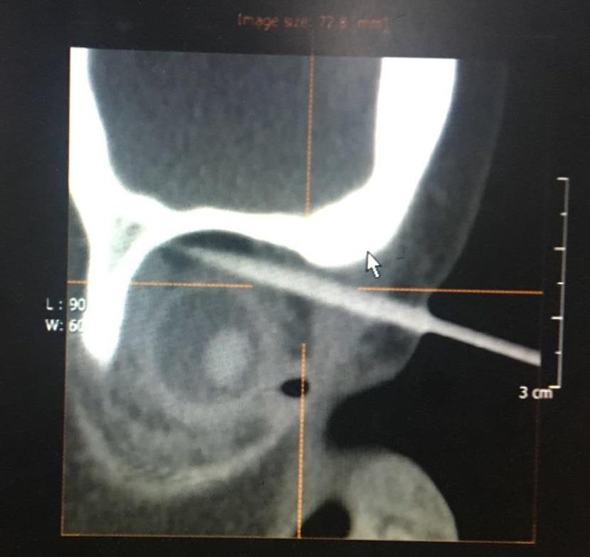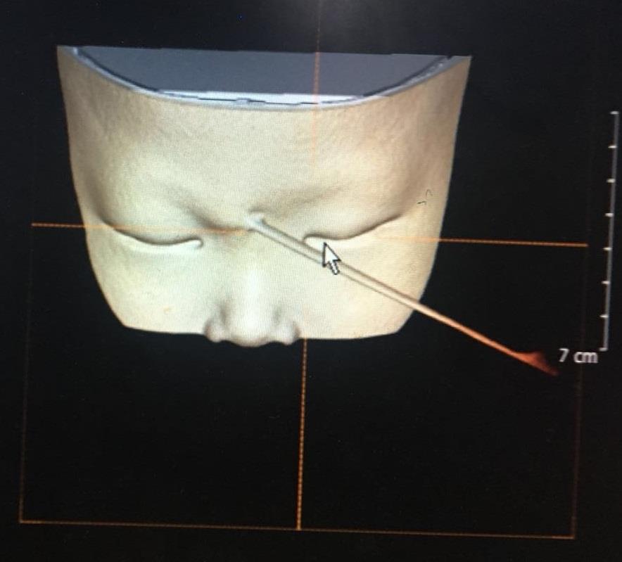 幸运的是,经眼眶CT检查后确认竹签从鼻根部进入上眶缘,并未进入颅内,经过上直肌与眼球擦肩而过。然而,怎么取?这是一个问题,外侧竹签长,内侧短,根据杠杆原理,你在外面稍有移动,可能就在里面如秋风扫落叶一般,伤害到重要的血管、神经,甚至,导致失明。正所谓差之毫厘,失之千里,查医师首先建议全麻。然而,2小时前患儿已进食,全麻需禁饮禁食6小时以上。但这个2岁的小朋友在竹签的折磨,越发烦躁,哭闹不安,家属深怕竹签位置在小孩的挣扎下不断地往深处去,造成更大的损伤,强烈要求医生尽早取出竹签。