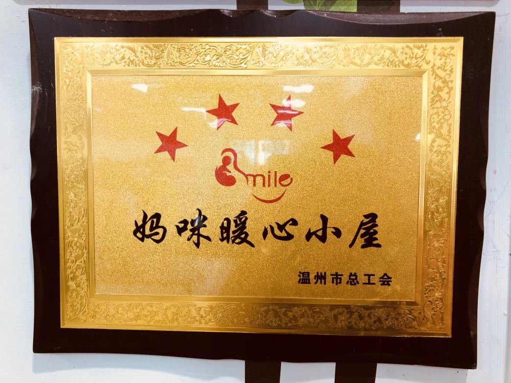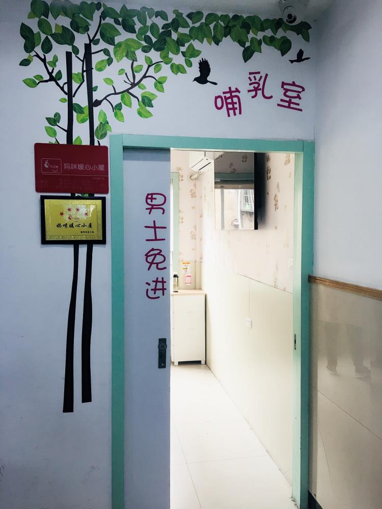 哺乳室的门口用绿色的树叶贴纸简单布置了一番,墙上还挂着温州市总工会颁发的“妈咪暖心小屋”牌匾。一进门,印入眼帘的是满墙的米黄色小熊墙纸,非常温馨。房间内放着几张长条沙发,还有婴儿护理台,为宝妈们提供了很大的便利。
