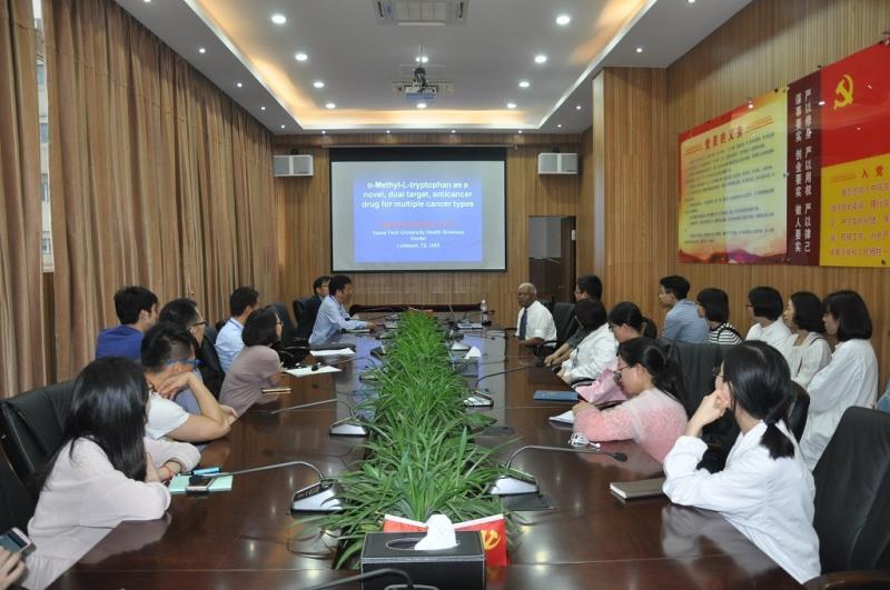 授聘仪式后,Ganapathy教授为我院医务人员作了题为《α-Methyl-L-tryptophan as a novel, dual target, anticancer drug for multiple cancer types》的学术讲座,介绍了其课题组在该领域的研究进展,具体围绕ATB0,+的发现及其作为肿瘤治疗的靶点、α-methyl-L-tryptophan作为该转运体的抑制剂、α-methyl-L-tryptophan作为IDO1的抑制剂三个方面进行详细的讲解,分析了α-methyl-L-tryptophan作为新的肿瘤治疗药物的巨大潜力。与会人员在认真聆听报告的同时也踊跃提问,现场气氛生动活跃。