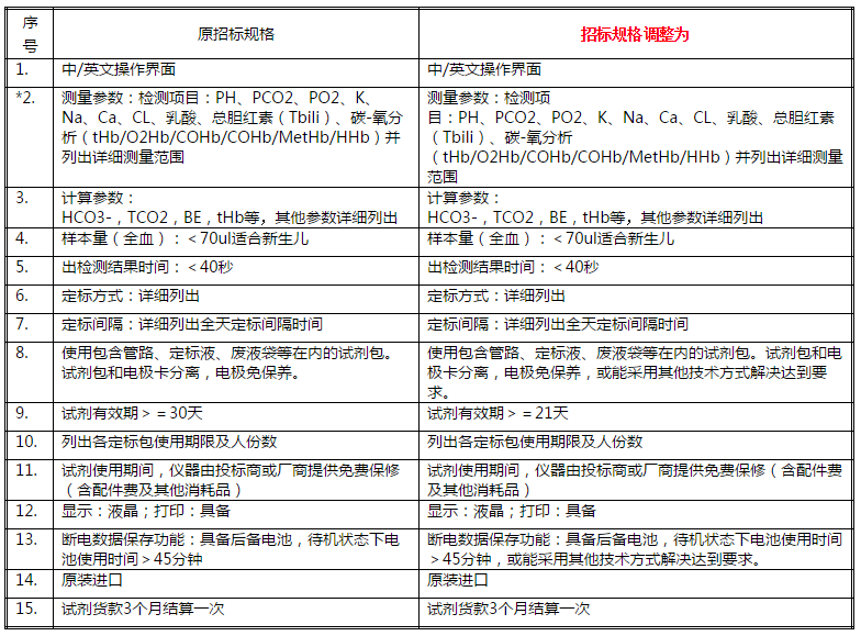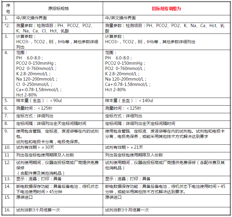 现就血气测定试剂盒招标采购各标段技术指标进行更正说明,具体更正信息如下: